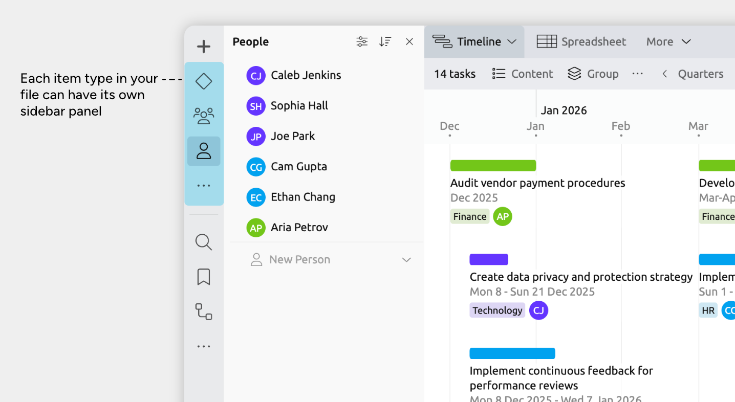 Each item type has its own panel in the sidebar, where all items of that type are listed.