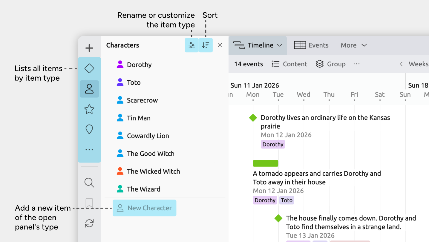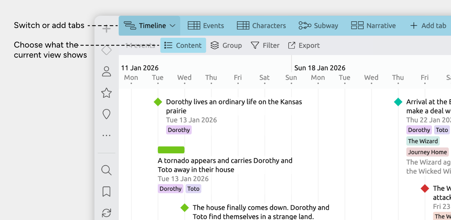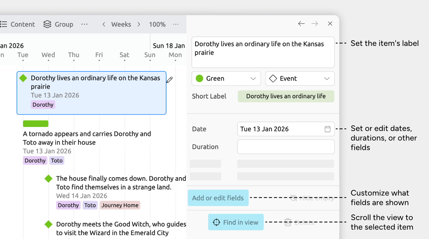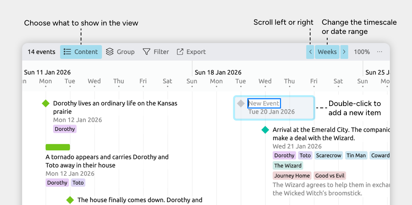The Timeline view lays your items out across time, from left to right, so you can see when things happen and how they’re ordered.