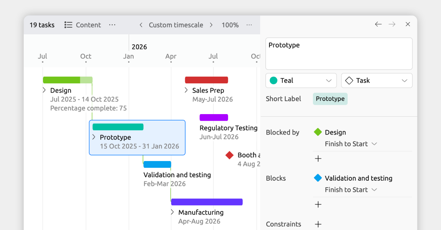 Dependencies and constraints help keep your timeline logically consistent as it grows and changes.