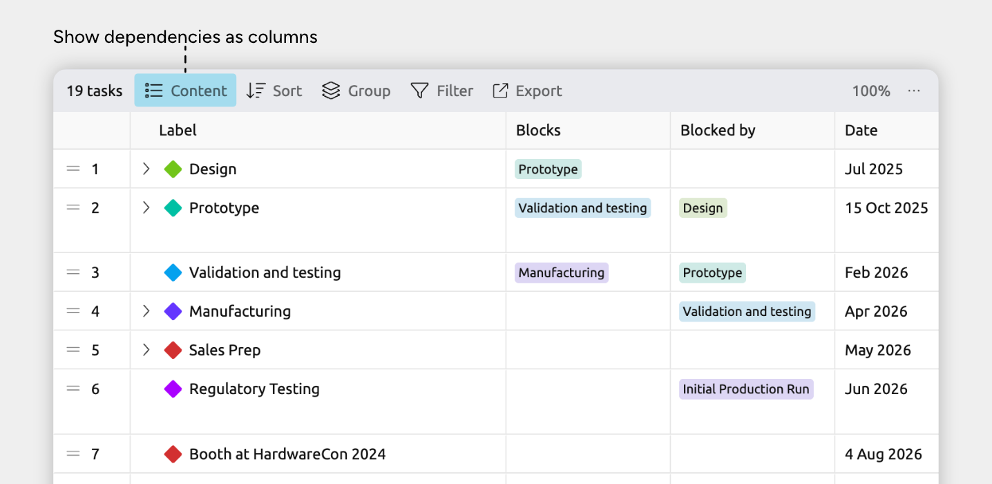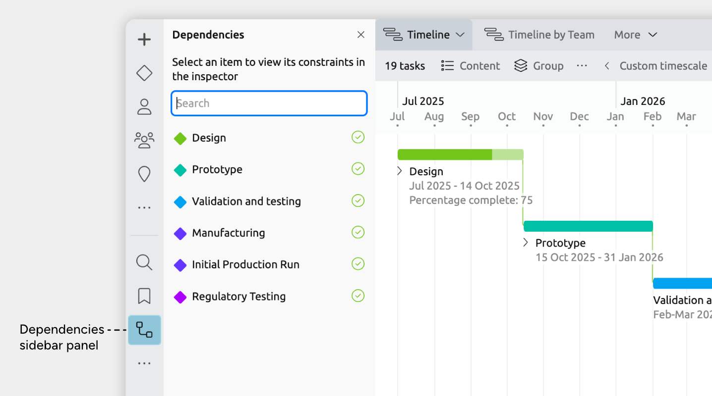 The dependencies sidebar panel shows a single list of all dependencies and constraints in your timeline. It’s useful for reviewing everything in one place and quickly finding any violations.