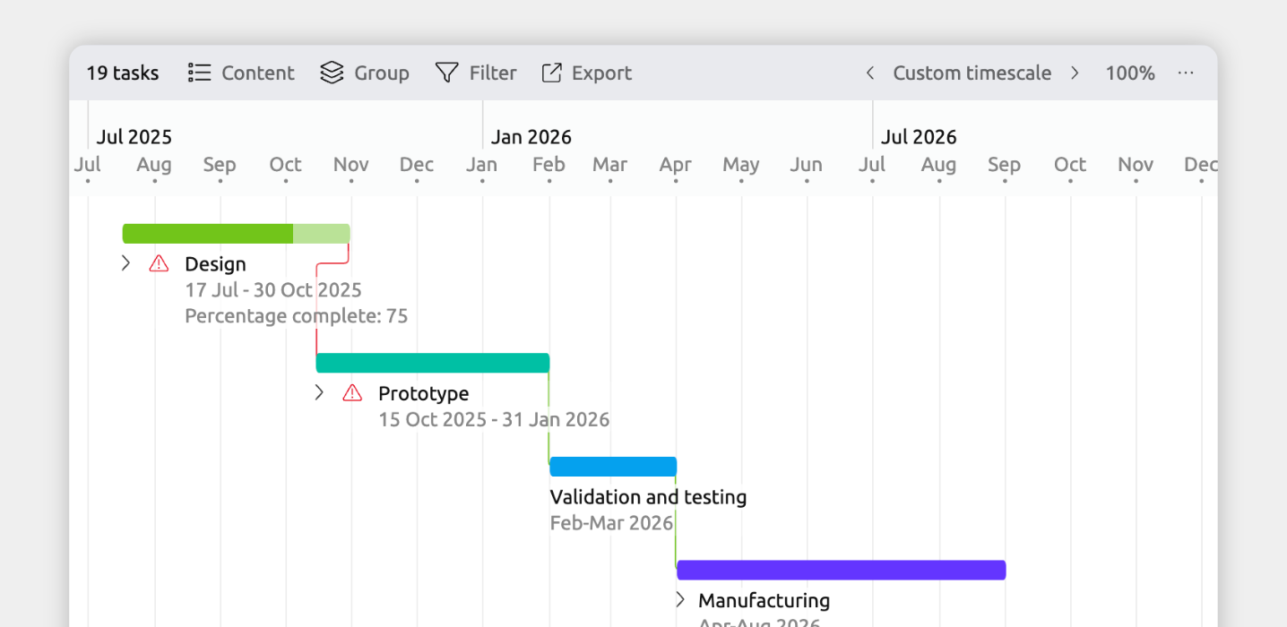 When a dependency or constraint is violated, Aeon Timeline shows a red warning icon to highlight the issue. Learn more about resolving violations →
