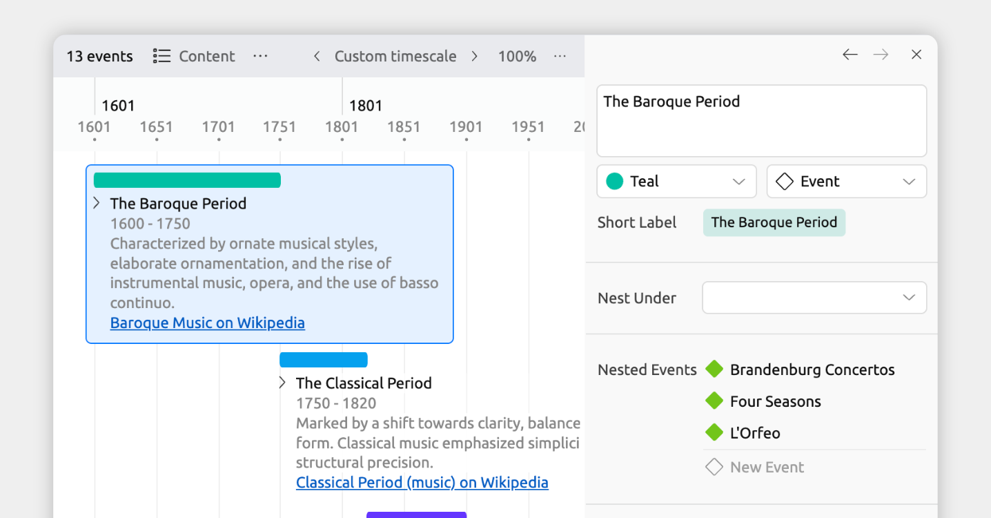 Note for story timelines: Nesting is useful when story events sit inside larger events on the timeline. If you’re arranging select events into chapters, acts, or other story structures, the narrative instead lets you pick events to put into folders. Learn more about the narrative →