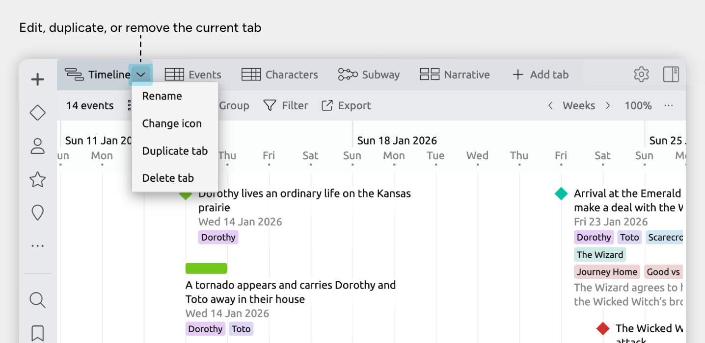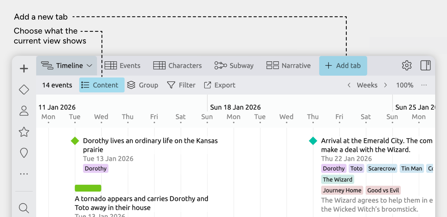 Aeon Timeline’s view types let you switch how you work without switching tools. You can plan on a timeline, edit details in a table, explore relationships, or organize your story narrative, all using the same data.
