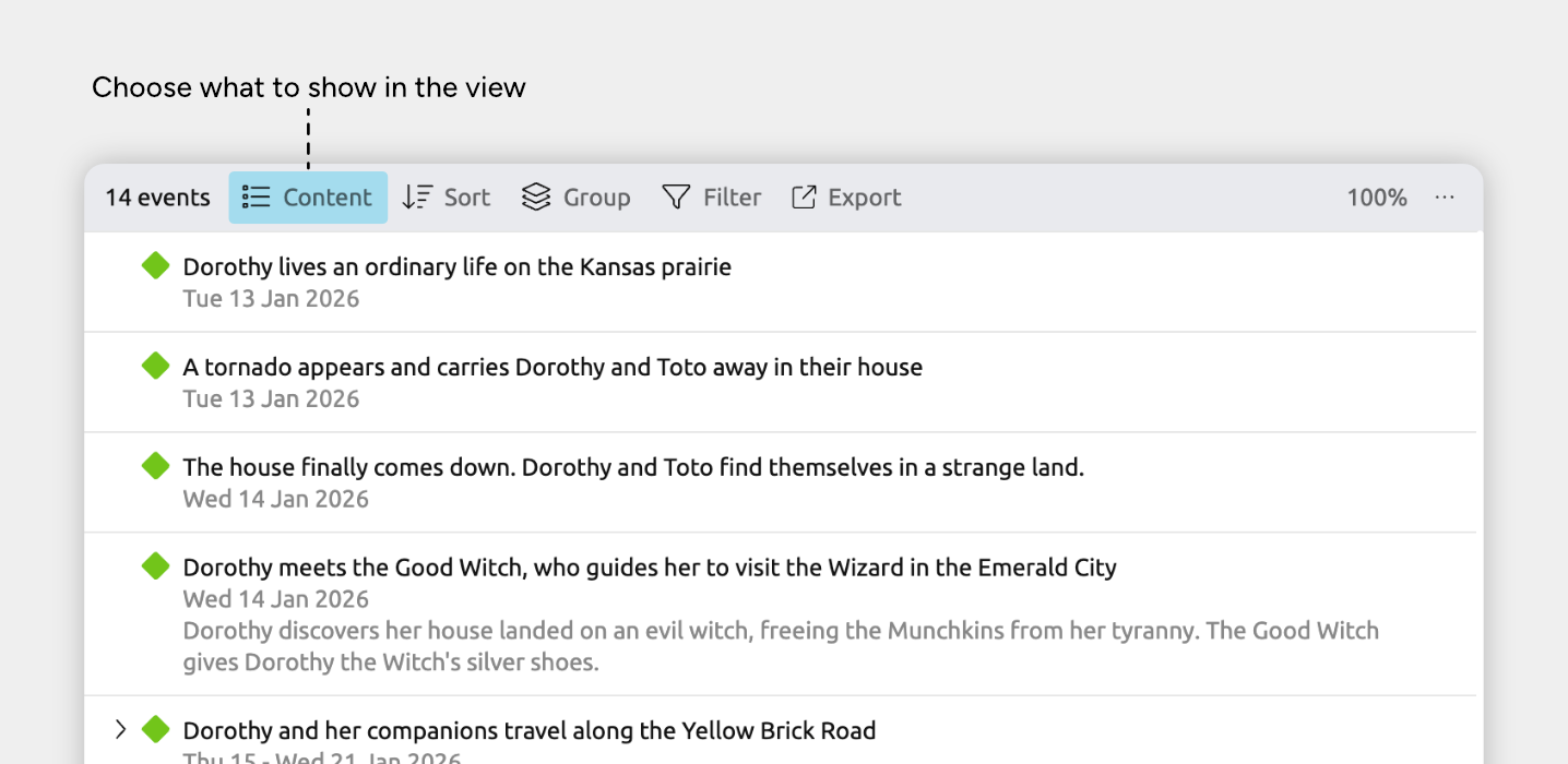 Note for narrative views: If you’re using a list view set to show the narrative (shown by the Narrative label in the view header), the rows will always show your narrative items and cannot be customized per view. Learn more about the narrative →
