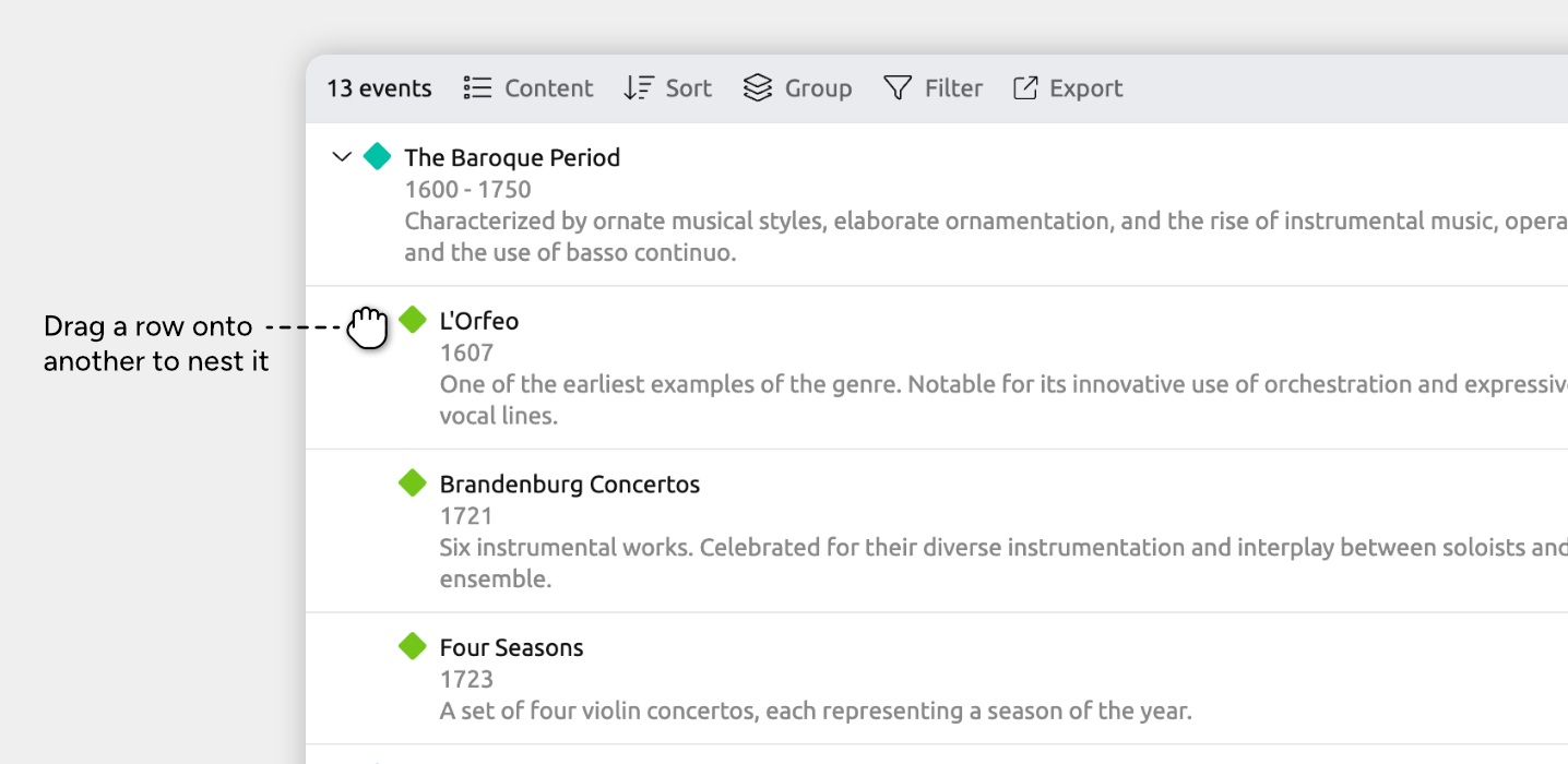 To nest items within the list, drag one row into another.