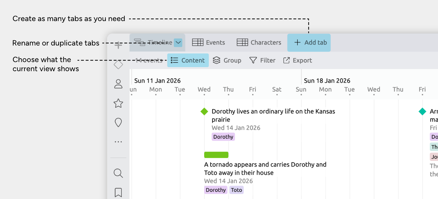 Aeon Timeline 3.5 replaces the fixed set of views with tabbed views, so you can build a workspace that matches how you think and work.